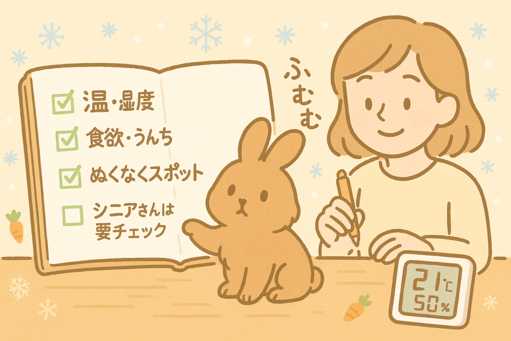 - 温度計・湿度計を、ケージの近く・うさぎの生活目線の高さに設置